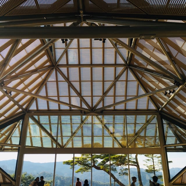 中に入ると、自然光が差し込み、目の前に一面の山と木々が広がる開放的な空間。